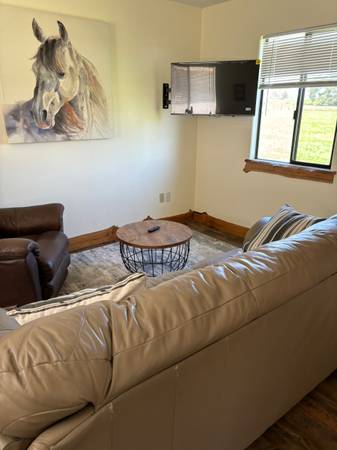 Beautiful setting! House located on 30 acres in the country but only 2.2 miles from town (Walmart, Target, Starbucks, Applebee's, Marshall's and many more!). Newly remodeled with, new floors, new washer/dryer, new queen bed, large desk/work space, new smart TV with wifi. Full size refrigerator, new microwave, blender, coffee maker, crockpot, cookware, dishes and silverware. Look out your windows and see green pastures with mini donkeys, horses, goats and cows. It just makes you smile. Yard work included. Very large bedroom with walk in closet and large desk. This place is a rare find, don't miss out.