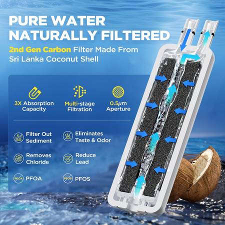 - DESCRIPTION: • PURE WATER, NATURALLY FILTERED - Featuring 2nd generation built-in carbon filter made from Sri Lanka coconut shell, our water filter can purify water in a natural way with 3X absorption capacity of others. The replacement effectively removes impurities like sediment, chlorine, lead, unpleasant tastes and odors through its multi-stage filtration process and apertures that are less than 0.5μm, ensuring safe and clear drinking water for you and your family. * CERTIFICATED CRAFT, RELIABLE QUALITY - The filter replacement is made of food-grade material without BPA and has the verified effect under NSF/ANSI 42. It's also tested against NSF/ANSI 372 for lead of the material less than 0.25%, for which you can confidently choose this filter, knowing it's safe and trustable for your use. * EASY SETUP, PERFECT FIT- With no tools required, our filter can be installed effortlessly in minutes It's perfect filter replacement for the following filter models: EDR1RXD1, EDR1RXD1B, WHR1RXD1, Filter 1, W10295370A, W10276924 W10291030, 9(contact info removed)P Kenmore 46-9930 46-9081 9081 P8RFWB2L (Please refer to the image for appliance models) * WORK STEADY, KEEP TIDY - Passing through 400 PSI burst pressure test & 100000 water hammer test, this water filter replacement promises you a smooth and steady experience. The sealing ring at the top will prevent any possible leakage during using. Each filter can be used for 6 months or 200 gallons of water for best results before it should be changed.