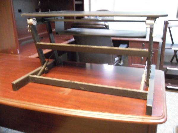 This is a desk riser to lift your computer monitor, keyboard, and mouse so you can use your computer from a standing position. The height adjustment is done manually. We are asking $80 OBO.