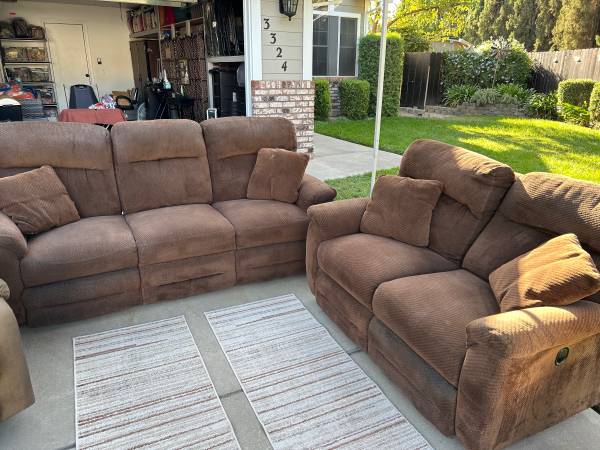 Sofa set brown, brand Lazy Boy has 4 recliners Chair recliner in good condition, color olive green, tv console dark wood, measurements Length 44/ high 36/ deep19/5 Sofa 7feet long, 36 inches deep,...