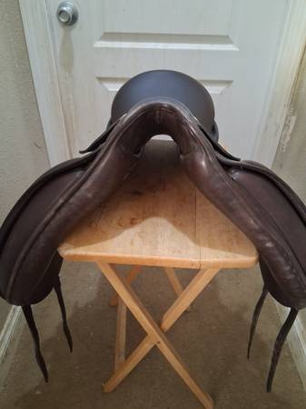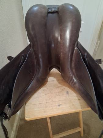 Beautiful chocolate brown soft leather and soft wool flocked with Jacob's wool. Made in England. 4.5 inch gullet (great for those horses who have withers). Flap length is 17 inches (great for a long...