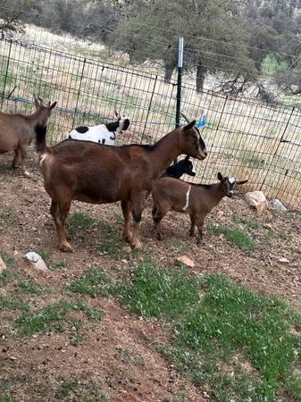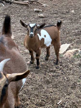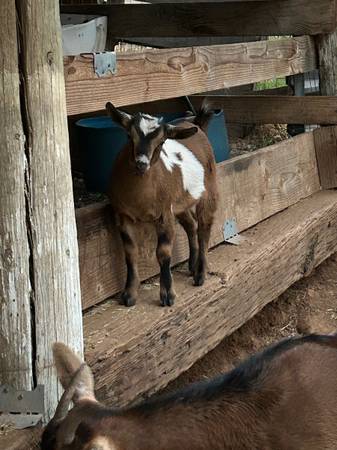 Female kid blue eyes skittish but young enough to tame, mom is in pictures with her dad is black with blue eyes. Born sept 12 eating orchard grass hay. She’s not going to be huge but not super small. I’m not sure what mom is but dad is Nigerian dwarf. Email with any questions or if you’d like to meet her.