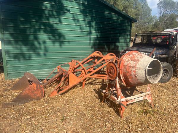 Ford 2N tractor with attachments: Wagner Iron front loader, 3pt cement mixer, 3pt wood chipper, 3pt receiver hitch with single tine trencher, 3pt crane, box scraper, and new carburetor and muffler....