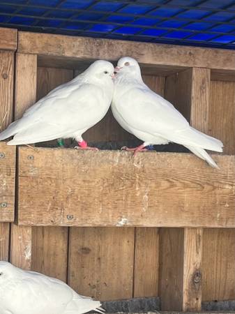 Beautiful white Pigeons. Hard to find. Can be used for weddings, funerals or ceremonial releases. Only 20 left. Going fast…