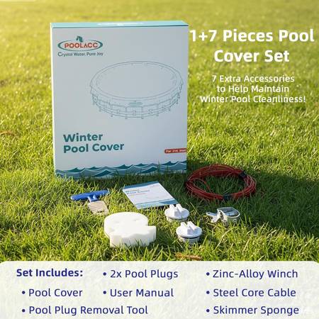 Accessories Included: Our pool cover kit comes with a skimmer sponge, 2 pool plugs and a removal tool. While our cover is durable enough, for complete winterization we highly recommend using it with our Pool Pillow (sold separately). The pillow absorbs destructive ice expansion pressure, while the cover keeps out debris. Together, they provide the ultimate defense for your pool investment