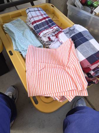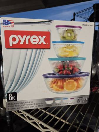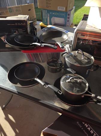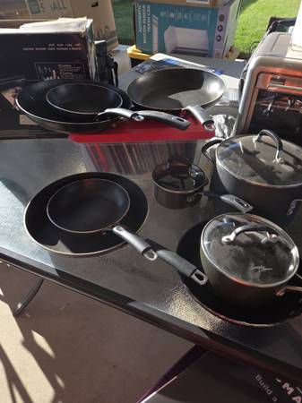 Exercise bike $100,Anchor glasses brand new $15, brand new mixing bowls $15, toaster oven $30 and used pot and pans set $25.