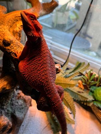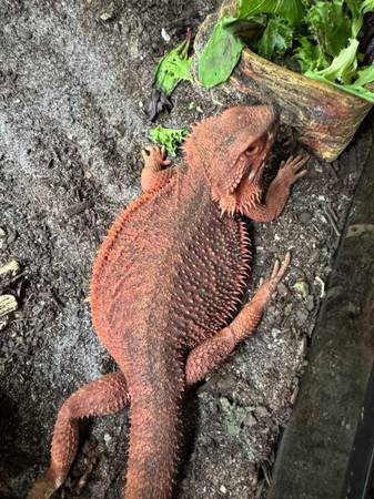 I need to rehome my 1 year old female (confirmed) red bearded dragon. I got her from the Sacramento Reptile Show and she has no health issues. Never been bred, has shed many, many times with no trouble. Eats voraciously and never says no to bugs and greens. She can be hand fed and is semi tame. She doesn’t bite, but will try to run off of you if she isn’t on the leash. She is very curious and wants to get into everything. Asking for a rehoming fee to recoup some of the 500 I paid for her at the show so please only text me about her with a reasonable offer attached. Experienced reptile people only! Text only to show contact info